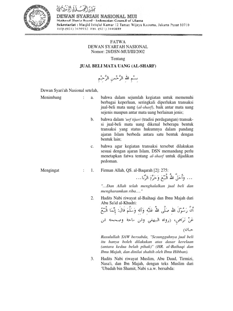 Fatwa ini berlaku sejak tanggal ditetapkan dengan ketentuan jika di kemudian hari ternyata terdapat kekeliruan, akan diubah dan disempurnakan sebagaimana mestinya. 14 muharram 1423 h / 28 maret 2002 m. Padahal, isi fatwa tersebut adalah mengenai skema jual/beli mata uang asing yang boleh dilakukan dan yang tidak.